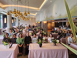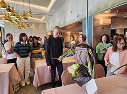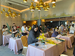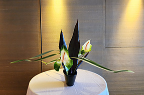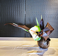 August 20, 2025 WorkshopThe August workshop was led by our seasoned and very experienced teaching member, Mr HO Hin-Shing. The theme of the workshop was “Text Book 3, Lesson 14: Composition of Surface by Using Leaves”. Mr HO used New Zealand flex, Black Cordyline and Anthuriums to arrange three different interesting and inspiring arrangements, showing the beauty and elegance of the leaf surface. The workshop was attended by 35 persons who had a wonderful afternoon with beautiful flowers, tasty food and happy chats.