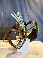 Workshop with Ishikawa Sensei – September 27, 2017 (Wednesday) at HKCCTitle: Composing with Branches-A Two-step Approach Materials: Philodenron, Dragon Willow, Gladiolus, Oncidium, Allium, Newzeland flax, Perch wood.