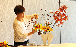 Ms Cindy Lau chose orange-red maple branches and yellow-orange lilies to bring out the theme of her arrangement “Memories of Autumn”.