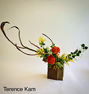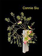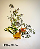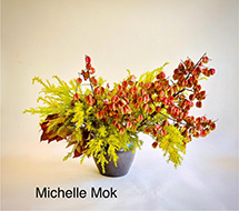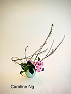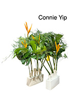 Ms Amy Leung presented an interesting free style arrangement by using eucalyptus, chrysanthemums and yellow dancing ladies.