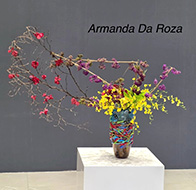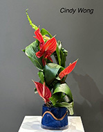 Ms Doreen Liu demonstrated how to compose unconventional materials with fresh plant materials. She twisted the aluminum wires playfully in her arrangement with china roots berries, anthuriums, and yellow dancing ladies.