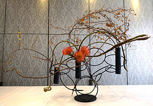 2015 Annual Exhibition Group WorksThe three group works got lots of compliments. Ms. Sumura Eikou, Master Teacher from Sogetsu Headquarters in Tokyo, started her arrangement with the help of her daughter Okubo Yasuka and her assistant Mochizuki Hiroshi in the lift lobby in the signature Sogetsu bamboo style. Mrs. Ebuchi Yoko made a “big construction” with the big wall which showed the real power of flowers. Sharon Chou created a “floating” arrangement in the small room.
