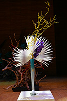 Demonstration at the Hong Kong Flower Show 2011The demonstration, conducted by Ms. Suikei Sakaguchi, Master Instructor from Sogetsu Headquarters, was a great success. She gave a step-by-step demonstration of 8 arrangements together with a simple and clear explanation of arranging procedures and techniques. For the final arrangement, she brought out a big wooden structure and invited a few members of STA HK on stage to create a free style display with white non-woven cloth and various kinds of giant green leaves. The arrangement turned out to appear as if a lady was posing in a white dress.