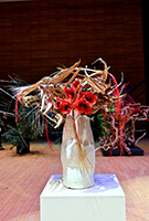 2013 Annual Exhibition Group WorksThe work at the entrance featured bamboo, drift wood, dried palm sheaves, camellia branches, dancing lady orchids and glories. The dried rubber tree leaves floated from the arrangement to the ceiling in elegant lines, creating a light and airy feeling. A truly exquisite creation to greet our guests!