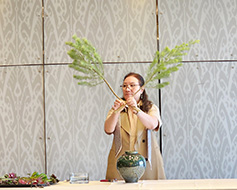Ms Doreen Liu demonstrated how to compose unconventional materials with fresh plant materials. She twisted the aluminum wires playfully in her arrangement with china roots berries, anthuriums, and yellow dancing ladies.