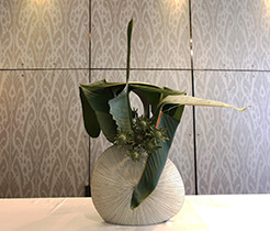 August 20, 2025 WorkshopThe August workshop was led by our seasoned and very experienced teaching member, Mr HO Hin-Shing. The theme of the workshop was “Text Book 3, Lesson 14: Composition of Surface by Using Leaves”. Mr HO used New Zealand flex, Black Cordyline and Anthuriums to arrange three different interesting and inspiring arrangements, showing the beauty and elegance of the leaf surface. The workshop was attended by 35 persons who had a wonderful afternoon with beautiful flowers, tasty food and happy chats.