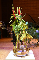 2013 Annual Exhibition Group WorksThe work at the entrance featured bamboo, drift wood, dried palm sheaves, camellia branches, dancing lady orchids and glories. The dried rubber tree leaves floated from the arrangement to the ceiling in elegant lines, creating a light and airy feeling. A truly exquisite creation to greet our guests!