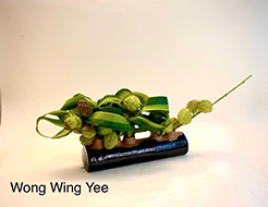 Ms Amy Leung presented an interesting free style arrangement by using eucalyptus, chrysanthemums and yellow dancing ladies.